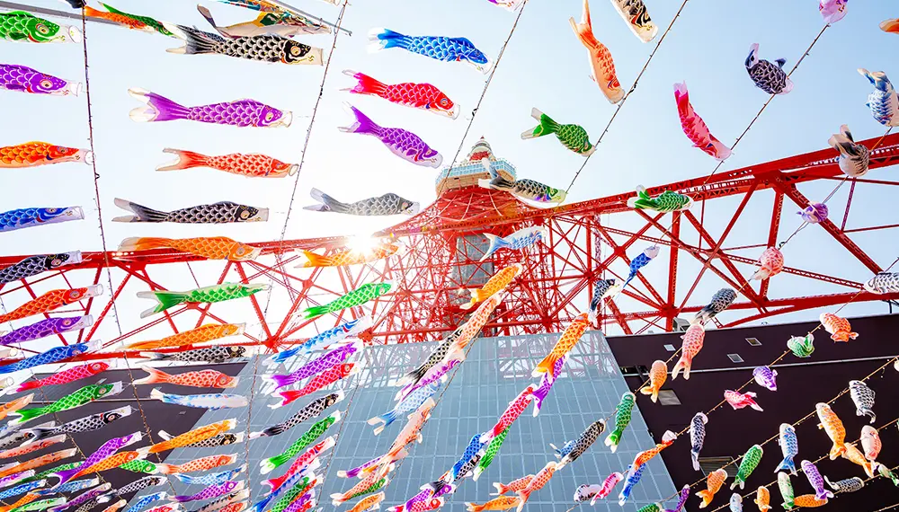 In Japan, May 5 is celebrated as Children's Day. It's a tradition to decorate your garden with koinobori (carp-shaped streamers) as a way of praying for the healthy growth of your children. 333 koinobori are displayed at Tokyo Tower, which is 333 m tall. At TOKYO SKYTREE TOWN, you can see over 1,000 koinobori swimming in the breeze.