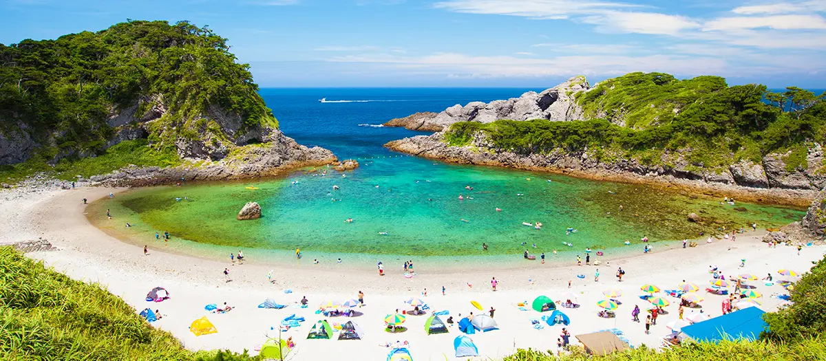 The northern corner of Shikinejima Island is home to the stunning Tomari Beach. In 2023, it was even ranked the number one most beautiful beach in Japan. The beach has a gentle curve with shallow waters, making it a great place for families with small children. It's also a wonderful location for snorkeling—you can spend hours watching a wide variety of fish. Tomari Beach is also an excellent day trip destination if you're staying at Niijima.
