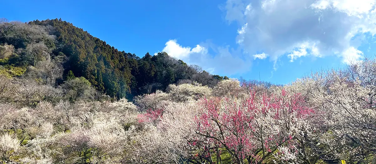 About 1 km from JR Takao Station, there are eight plum groves along Kyu Koshu Kaido Ave and the banks of the Kobotokegawa River, from Kamikunugida-bashi Bridge to Kobotoke Pass. Together with the surrounding farmland, mountainside, and traditional residences, there are around 10,000 plum trees in the area blooming in shades of white and red. Four of these groves (Takao Plum Tree Road, Sekisho Plum Grove, Tenjin Plum Grove, and Surusashi Plum Grove) have events during the festival. In addition, two of the plum groves, Kogesawa Plum Grove and Surusashi Plum Grove, will be specially opened to the public between Saturday, March 7 and Sunday, March 22, so visitors can enjoy the sight and fragrance of the plum blossoms in season.