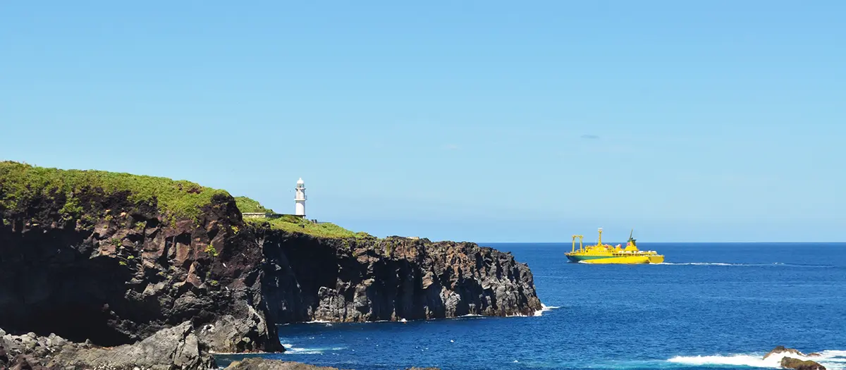 On the east side of Miyakejima Island is Satado-misaki Promontory—a lookout point that stands atop rugged cliffs 20 meters above the ocean. The unusual shape of the promontory was formed when the waves eroded the lava that flowed into the sea. A chalk-white lighthouse overlooks the promontory.