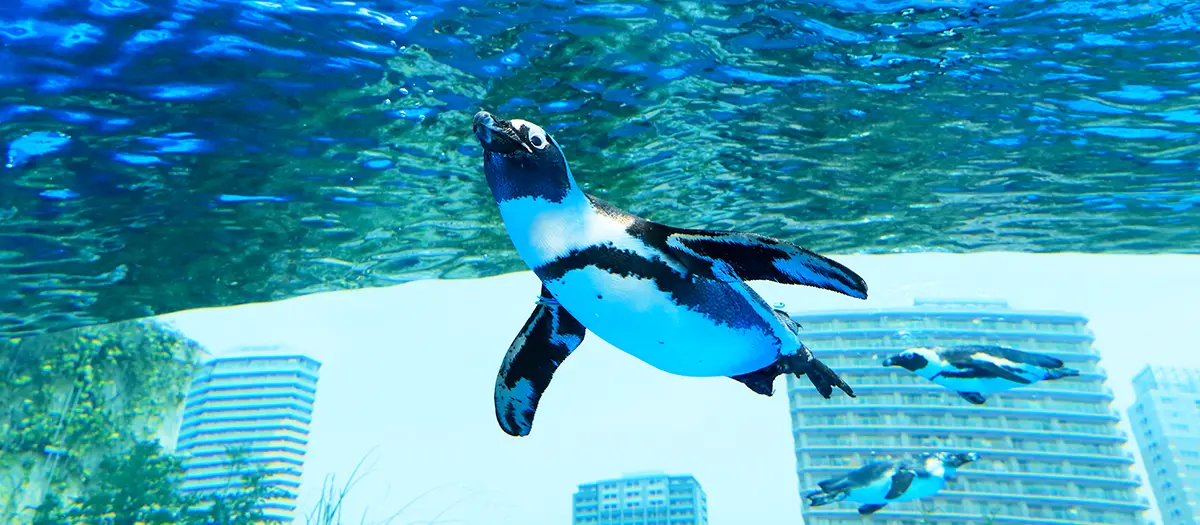 - Watch sea lions, penguins, and other animals swimming against skyscraper backdrops