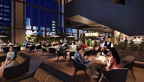 The luxury hotel Fairmont Tokyo occupying the upper floors offers cafes, restaurants and terraces open to the public, providing breathtaking views of Tokyo's skyline. Blue Front Shibaura also features a dedicated boat landing, with plans to develop cruise experiences in collaboration with Fairmont Tokyo utilizing the pier.