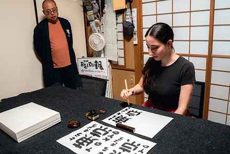 Writing is a part of daily life, whether it be typing an email or jotting down a grocery list. You often do it without thinking. Udoyoshi Calligraphy Class turns your attention back to the act of writing, rather than its meaning. This calligraphy course teaches Gendaibun no Wayoh (Modern Japanese Wayoh), a type of calligraphy that focuses on modern Japanese script instead of traditional Chinese kaisho—square style—characters. After choosing your desired words, the teacher provides a writing demonstration. Then, it is your turn. As you glide the ink across the white paper, your concentration and senses will sharpen, and you will notice self-expression in every stroke. Your teacher’s gentle guidance will help you experience mindfulness through calligraphy.