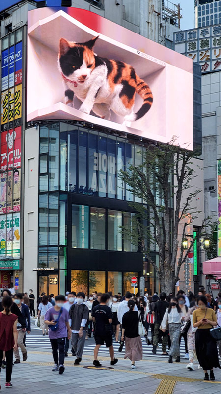 A year before the Akita dog arrived on the scene, a cat was already meowing from a billboard near Shinjuku Station. Referred to as “kyodai neko” (giant cat) and “mikeneko” (calico cat) by its fans, the cat is the creation of Cross Shinjuku Vision. It can be perceived as three-dimensional thanks to the curve of the billboard's screen.