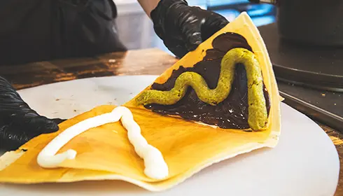 Dubai chocolates are trendy, luxurious chocolates first made in Dubai that contain pistachio and kadaif, thin pastry noodles made from flour and water. They were chosen as the Jiyugaoka store's signature item because their luxurious taste matches the luxurious feel of the neighborhood. Staff members handmake the Dubai chocolates in-store and add them to the top of the crepes.