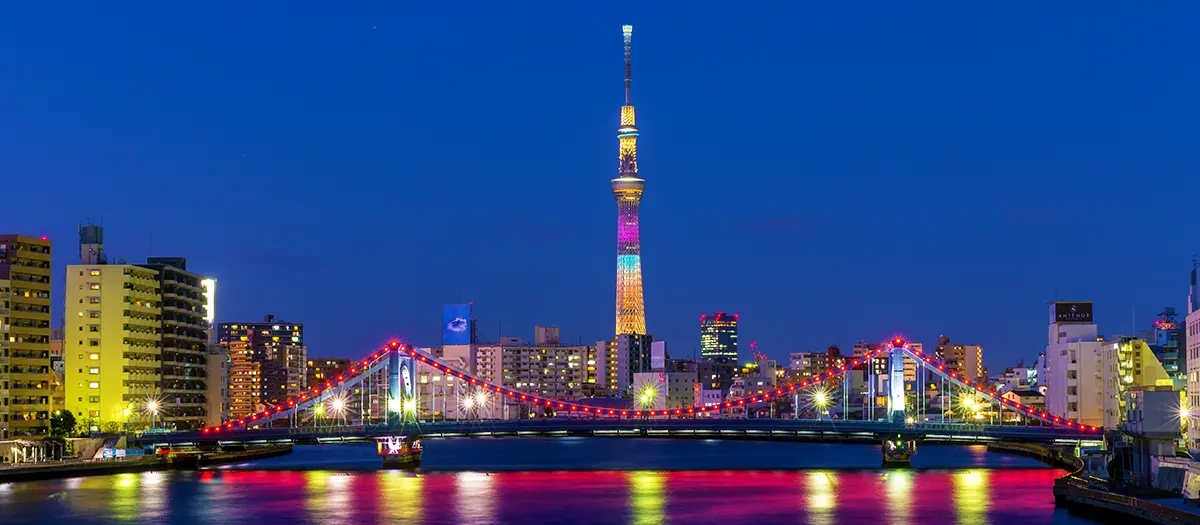 Take an evening stroll along the Kiyosu Bridge to admire Sumida River's scenic beauty