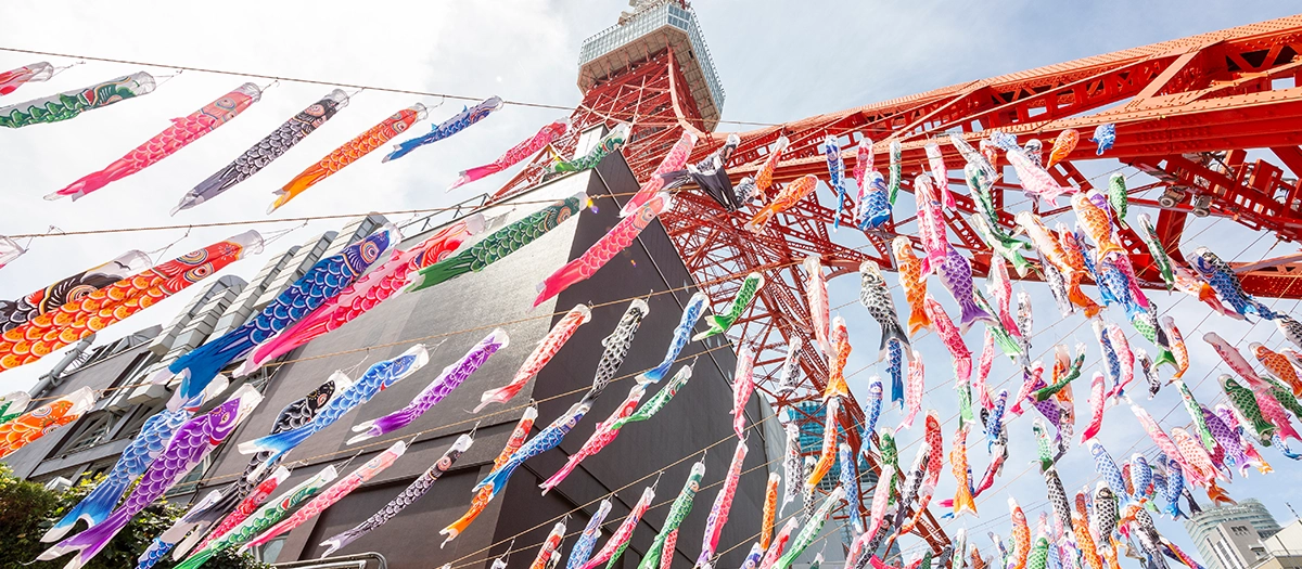 The 333 vivid carp flutter in the wind, referencing Tokyo Tower's height of 333 m. When the wind catches them, the streamers look like a school of fish swimming through the sky.