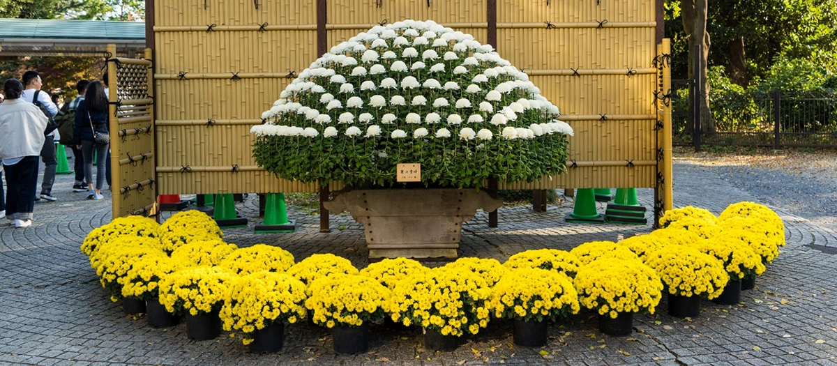 The chrysanthemum flower beds exhibition at Shinjuku Gyoen National Garden is a series of flower displays arranged under the shelter called Uwaya. Walk along the winding paths and enjoy the wide variety of colors and unique patterns of the chrysanthemum displays in Japanese Traditional Garden.