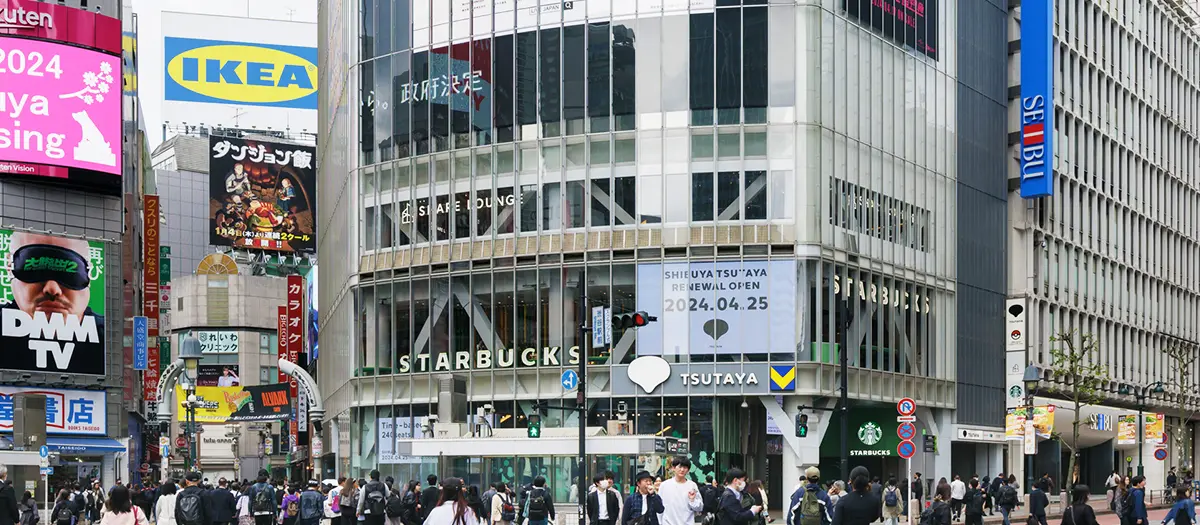 The Qfront building is a Shibuya landmark which directly faces the Shibuya Scramble Crossing and features a giant display screen (known as Q's Eye). Shibuya Tsutaya takes up floors B2 through 8. There are Starbucks Coffees on the 1st and 2nd floors as well.