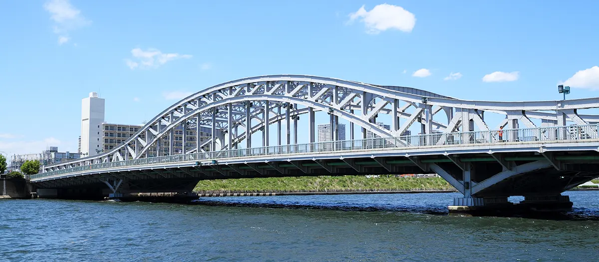Not only is the current 168.8-meter-long bridge stylishly designed with a center arch sloping down on both sides, but it also offers unobstructed views of Tokyo Skytree illuminated at night. The bridge was built in 1931 and serves as an important connection between Arakawa City, Sumida City and Taito City.