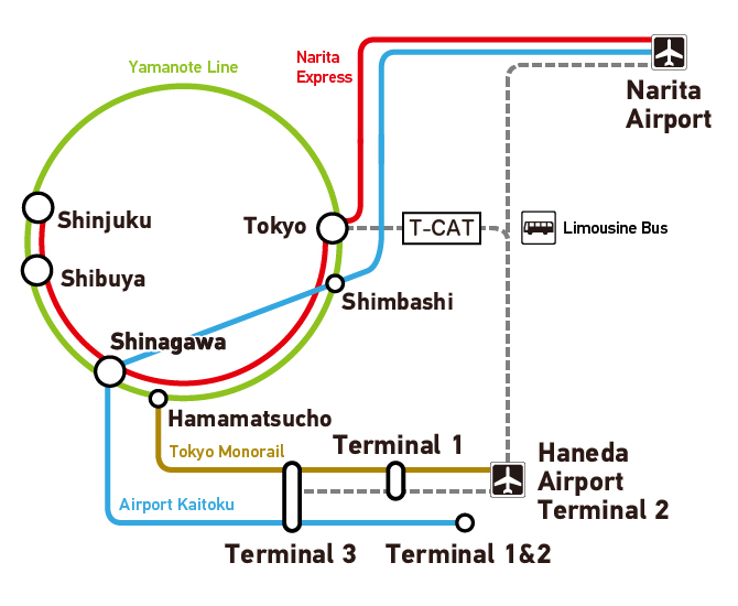 Keikyu Line express trains operate from each terminal to Shinagawa Station on the JR Yamanote Line—the loop line that encircles the city—allowing you easy access to the rest of Tokyo. You can also take the Tokyo Monorail to Hamamatsucho, another Yamanote Line station closer to Tokyo Station.