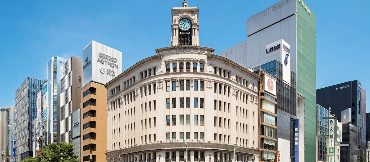 Located on the corner of Ginza Yonchome in Tokyo's elegant shopping district, Wako is both a beloved landmark best known for its clock tower and a popular department store specializing in luxury items. Owned by the world-famous Seiko watch brand, the building with the clock tower dates back to before World War II and miraculously survived the devastating firebombing of Tokyo.