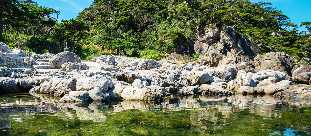 This is the only onsen with clear water on Shikine-jima Island. Its location right on the rocky seashore makes it extra special. You can enter this unusual onsen for free at any time of day or night, but don't forget your swimsuit. The hot spring heats the rock formation, so the temperature of the water changes with the ebb and flow of the tide. Experimenting to find the best place to enter the water adds another dimension to the fun.