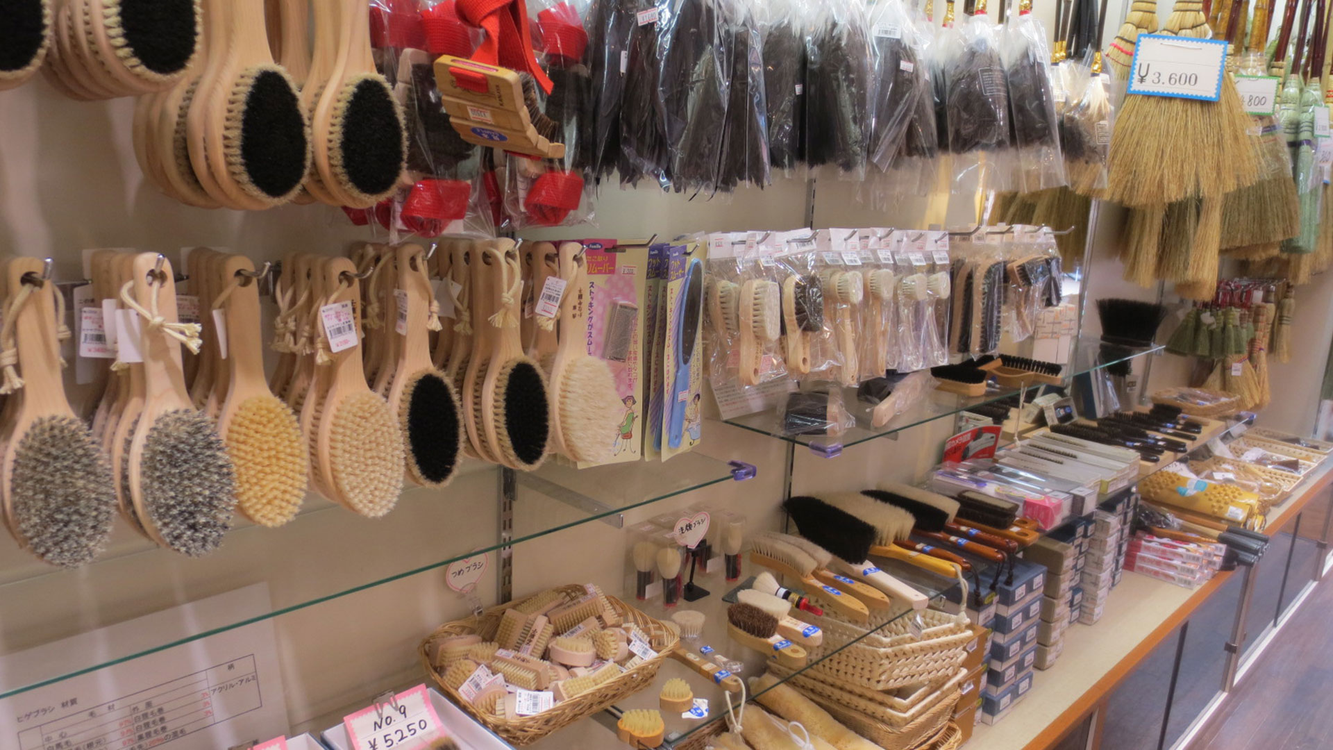 There are hundreds of different brushes at Kanaya Brush. The body brush collection includes specific brushes for teeth, hair, nails, face, body, and even beard. There are specific brushes for use on different fabrics, for cleaning socks, and for shoe care. Specially crafted brushes for food preparation, artisan brushes, and cleaning brushes are also available. Traditional Japanese kitchen cleaning brushes called tawashi are a rare item to find outside Japan but are an integral part of the Japanese lifestyle—making a tawashi a unique and meaningful souvenir from Tokyo.