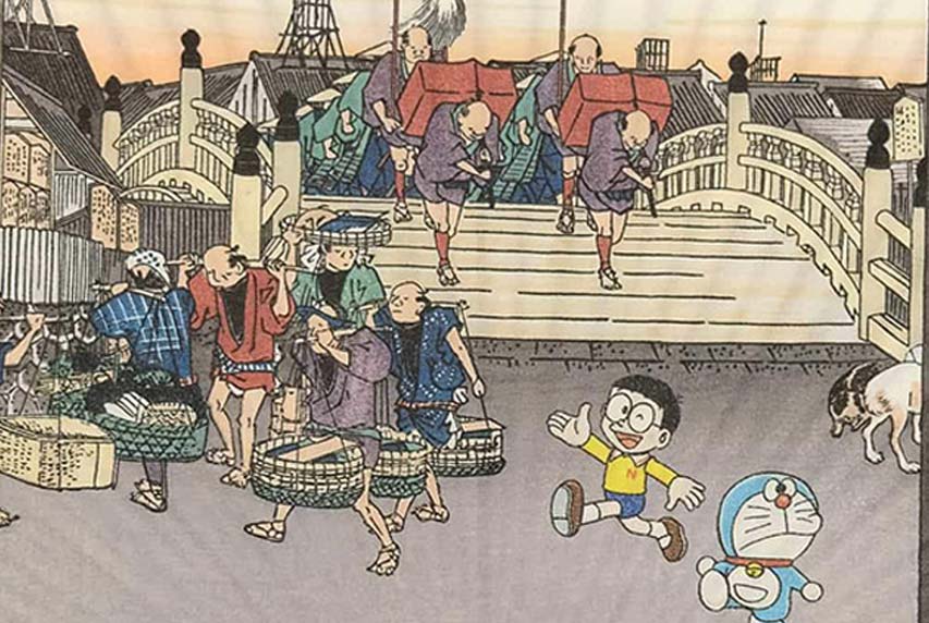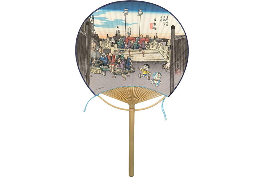 Uchiwa-e, handheld uchiwa fans adorned with ukiyo-e woodblock print images, have been popular since the Edo period. They showcase the work of various artists, incuding Toyokuni, Kuniyoshi, and Hiroshige. The "Doraemon x Ibasen" fan collection features images of characters from the popular Japanese anime series Doraemon in the style of Hiroshige's traditional woodblock prints.