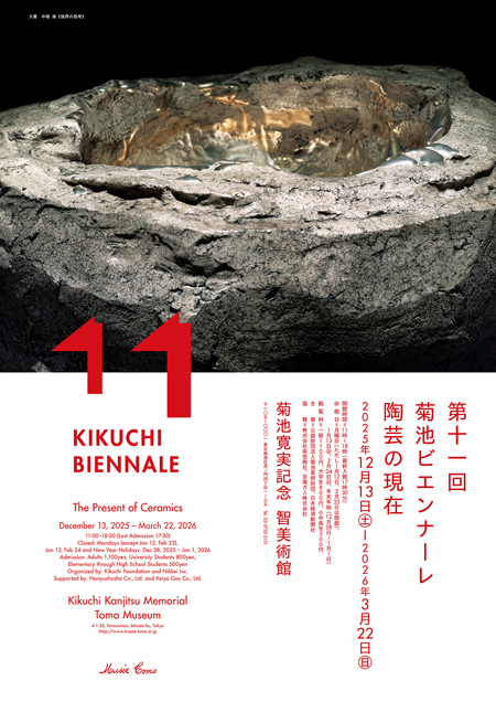 A display of ceramic artworks submitted by the public for the 11th Kikuchi Biennale. Introducing 46 prize-winning pieces selected from 452 entries, this exhibition showcases “the present of ceramics” through works from a wide array of artists.