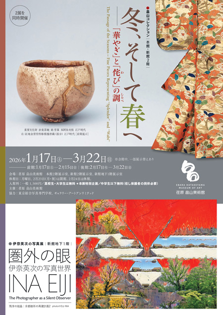 A public exhibition showcasing fine works from the Hatakeyama Collection, with a focus on tea ceremony utensils. It explores the two extremes of “splendor” and “wabi” in step with the changing seasons. At the same time, a retrospective exhibition of works by photographer Ina Eiji will also be held.