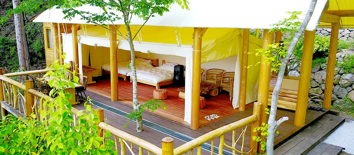 The glamping facility is available for rent to just one couple per day, and a personal chef cooks locally grown vegetables and wagyu (Japanese beef) right in front of you, so you can enjoy fine dining.