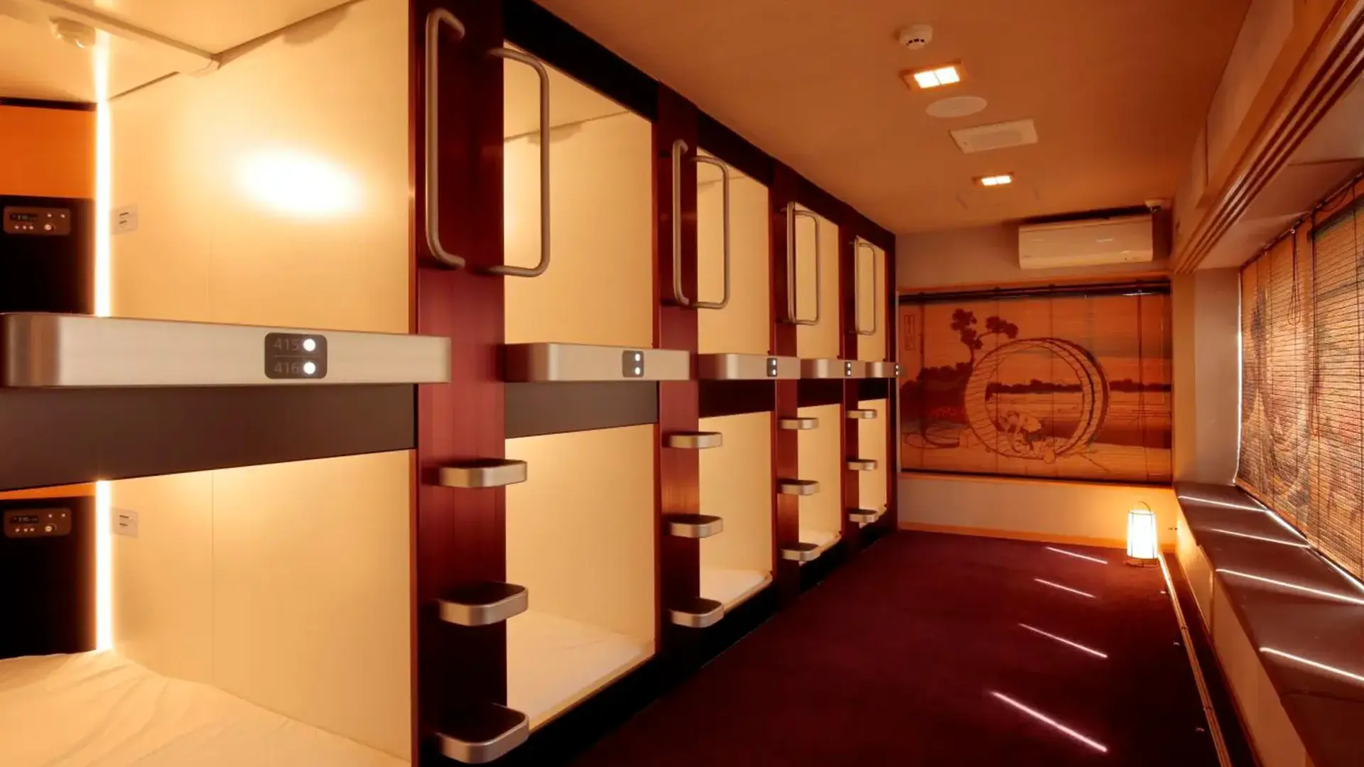 A capsule hotel, also known as a pod hotel, is a unique type of basic, affordable accommodation. Each guest occupies a capsule, essentially a bed-sized pod, that you can close either with a door or a curtain (the door will not lock, as per Japanese law). These capsules are arranged in rows, double-stacked. It is typical, but not guaranteed, that your capsule will have an air-conditioning unit as well as power outlets for charging your devices. Belongings are usually stored in a locker provided by the hotel.
