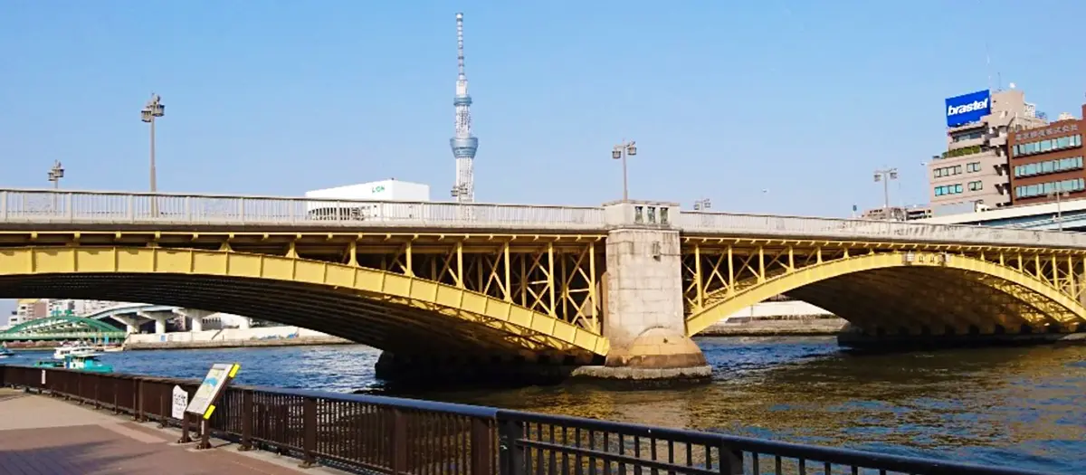 Built in 1927, this three-span, golden arch deck bridge, with six traffic lanes and wide sidewalks, forms a dramatic silhouette as it crosses the Sumida River. Look out for the alcoves that line the way, featuring motifs of sumo wrestlers.