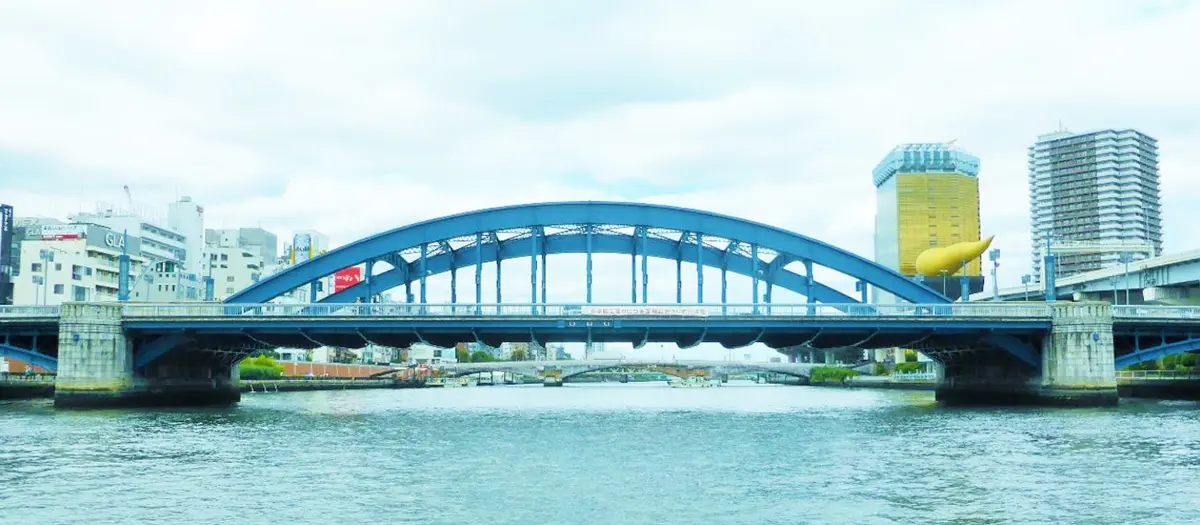 This blue, art-deco style bridge was finished in 1927 and crosses Sumida River. In the middle of the bridge is an alcove with a clear view of famous Tokyo Skytree, so make sure you stop and take a picture.