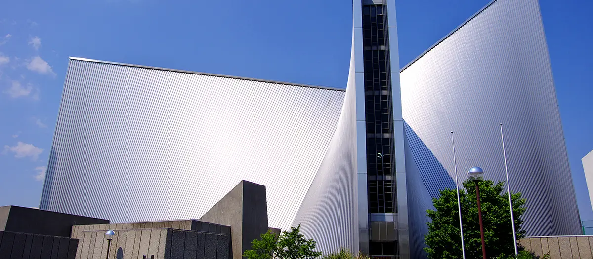 The cathedral is notable for its modernist structure, made up of eight curved walls, or hyperbolic parabolas, which form a large cross. It is made of concrete covered by stainless steel. The imposing interior has seating for 600 and standing room for 2,000. It also contains Japan's largest pipe organ. Concerts are also held here due to the building’s excellent acoustics.