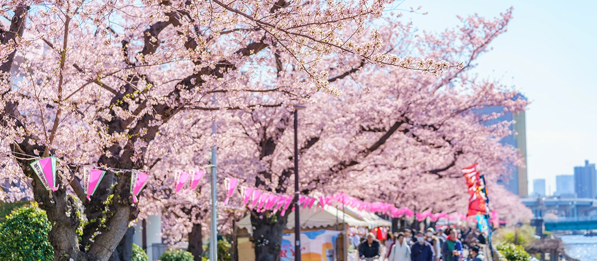 The banks of the Sumida River have been a famous destination for cherry blossom viewing since the Edo period (1603–1867). This festival takes place on the Taito City side of Sumida Park, which contains 510 cherry trees, including the Somei-yoshino and Oshima varieties. As you walk along the riverbanks, you can take in the stunning sight of the blooming cherry trees with the TOKYO SKYTREE in the background. Other fun activities include taking a ride on a traditional yakatabune boat or on the Tokyo Water Bus, both of which will give you panoramic views of the trees as you float down the river. The festivities continue after the sun goes down—the trees are illuminated, giving you an opportunity to try out yozakura (nighttime cherry blossom viewing).