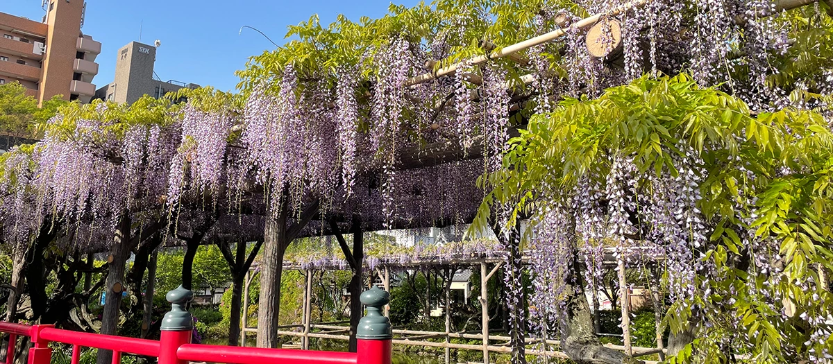 Kameido Tenjin Shrine has been called the best place in Tokyo to see wisteria in bloom. Beneath the wisteria trellises is a quiet pond, creating a tranquil scene of purple flowers reflected on the surface of the water. These wisteria vines were planted during the Edo period (1603-1867). Records indicate that Tsunayoshi, the fifth Tokugawa shogun (military commander), and Yoshimune, the eighth Tokugawa shogun, visited this shrine to see the wisteria. These legendary flowers are also the subject of many ukiyo-e prints and other works of art.