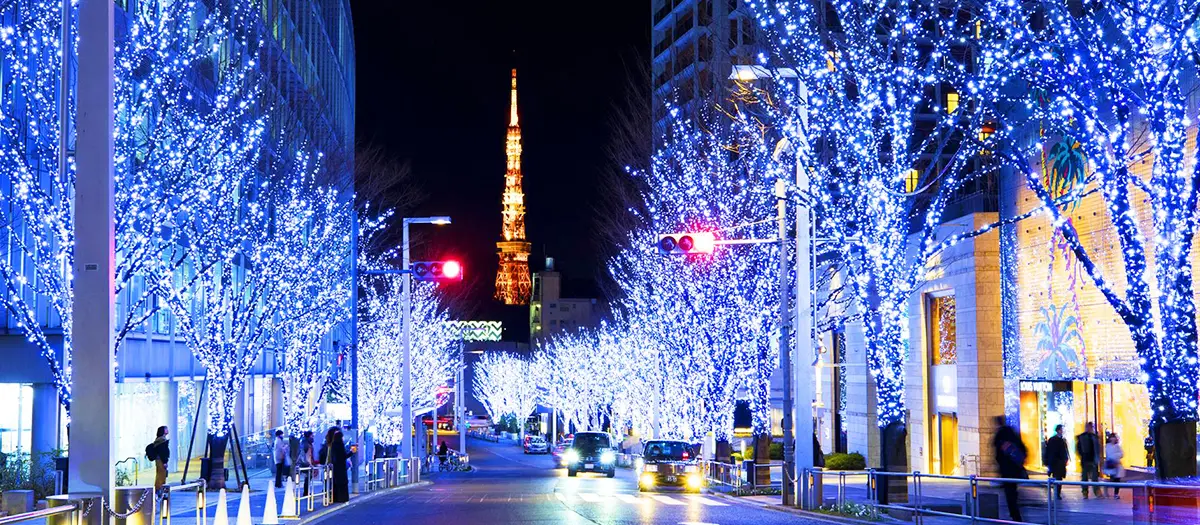 Light displays are held all around the city, at retail hubs, landmarks, and festivals. The trees along Marunouchi's main shopping street are lit up in a signature color: champagne gold. In YEBISU GARDEN PLACE, you can see one of the world's largest Baccarat chandeliers, containing 250 lights. The light displays around Tokyo Station, Omotesando, and Roppongi Hills are also worth visiting. A short trip from central Tokyo is the amusement park Yomiuriland, which puts up a popular gemstone-themed light display.