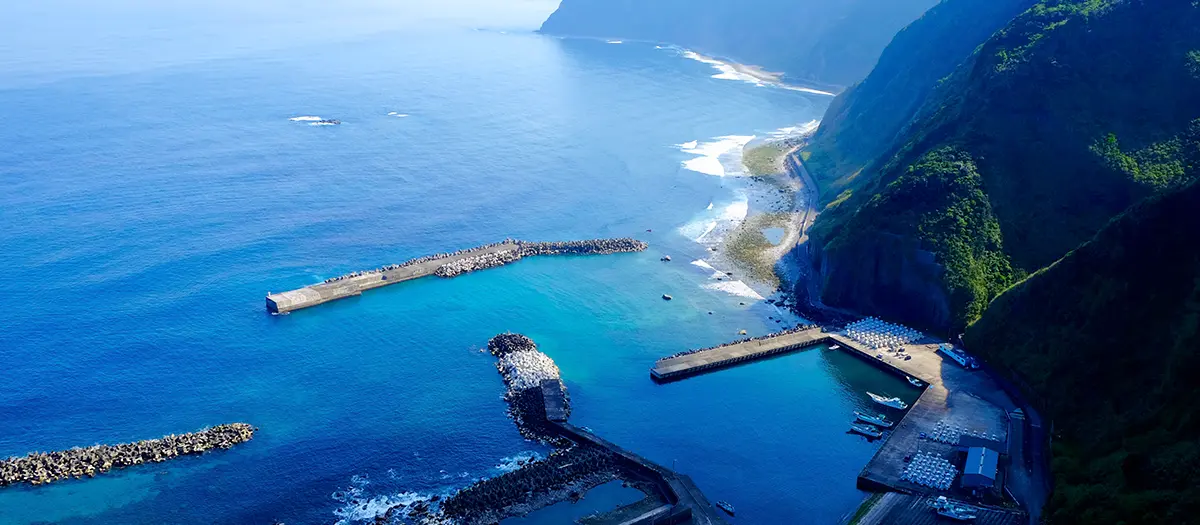 Hachijojima Island has beautiful views everywhere, but there are eight viewing points you really shouldn't miss. One of the "eight scenic spots" is seen from the Nago Observatory. From here you can see waterfalls among cliffs to your right, and the vast expanse of the Pacific to your left. Below is the bow-shaped Borawazawa Bay, dotted with quaint fishing villages. See the island as the seagulls see it.