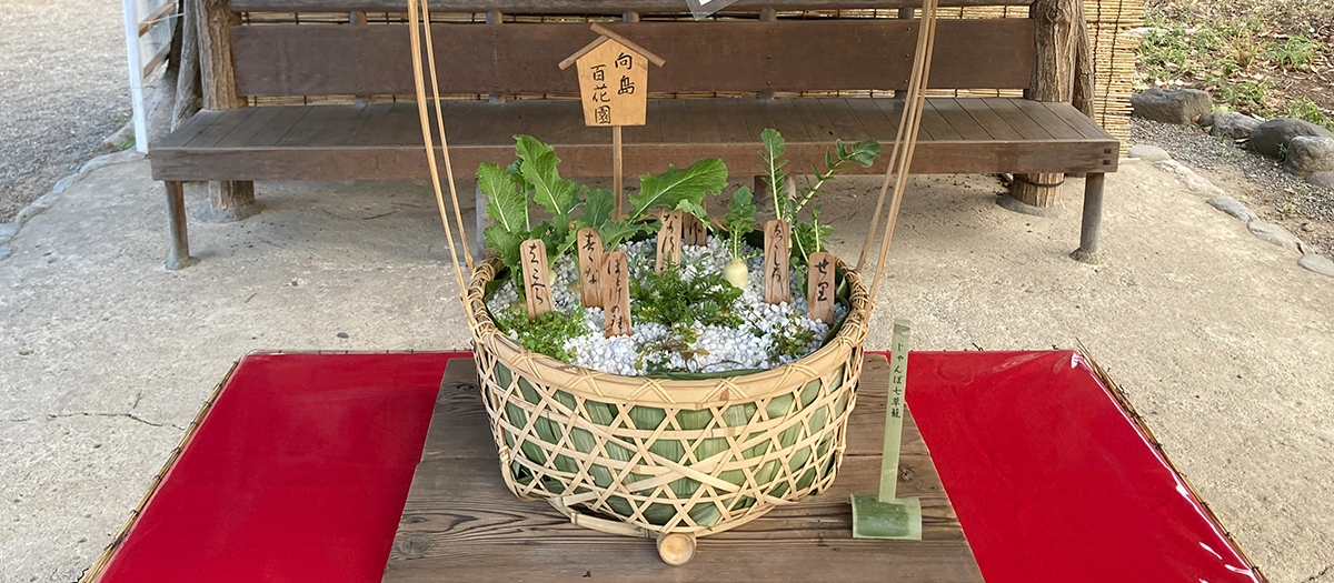 Over the New Year period, the Mukojima-Hyakkaen Gardens play host to an annual tradition that sees the seven plants of spring (parsley, shepherd's purse, Jersey cudweed, common chickweed, henbit, turnip, and daikon radish) arranged in special baskets called "nanakusa-kago."