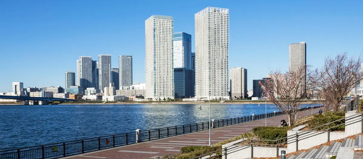Built on a former shipyard site, Harumibashi Park is one of 38 marine parks in the Tokyo Bay area. Visitors can relax on the expansive sun terrace that overlooks the bay.
