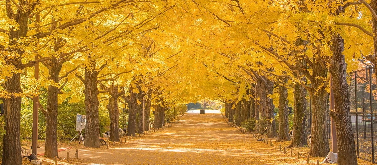Showa Kinen Park is renowned as a place to enjoy the colors of autumn. The two ginkgo-lined promenades, one at the canal and one at the sports park, are covered in a golden blanket of fallen leaves. As you walk down these beautiful paths, you can gaze up at the leaves still overhead glowing in the sunlight. The maples in the traditional Japanese garden turn bright red, beautifully complementing the rest of the trees. The park also hosts events such as tours and tea parties.