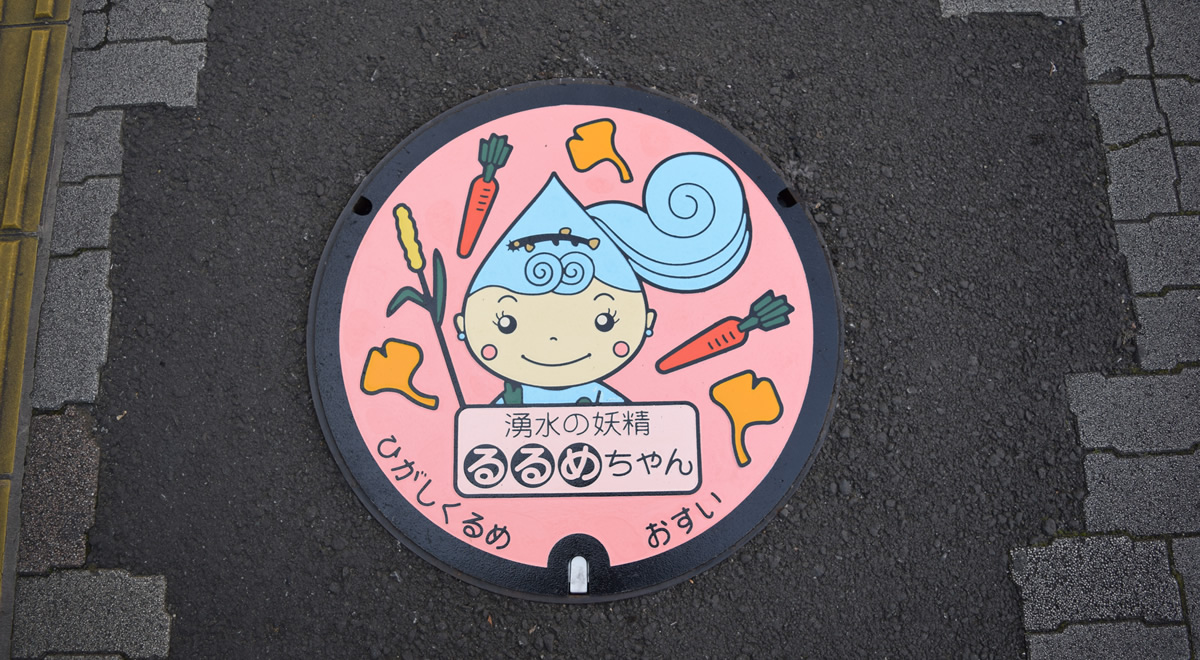 Custom-designed manhole featuring motifs based on Spring Water Fairy Rurume-chan, Higashikurume City's PR character for local resources.