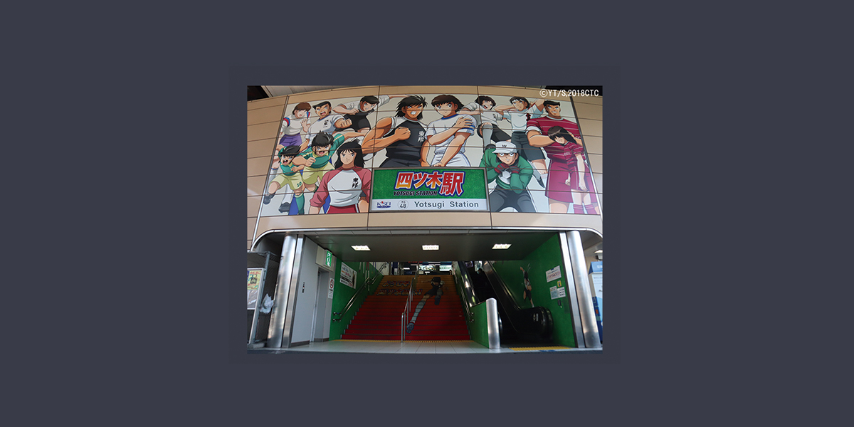Many locations at Yotsugi Station are decorated with Captain Tsubara. The ending theme song (Moete Hero) of Captain Tsubasa animation is used as the melody that inform us of a train's coming to the station. In addition to the decoration inside the station, there is a Tsubasa Ozora ticket art exhibition (illustrated by Yoichi Takahashi) made by combining approximately 110,000 used tickets.