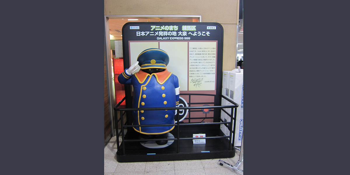 There is a life-size figure of a conductor of Galaxy Express 999 who became stationmaster of Oizumi-gakuen station on the Seibu Railway Ikebukuro Line in 2008. The figure watches over safety of passengers. The author Leiji Matsumoto has lived in Oizumi for over 50 years. The departure melody at Oizumi-gakuen Station is, of course, Galaxy Express 999.