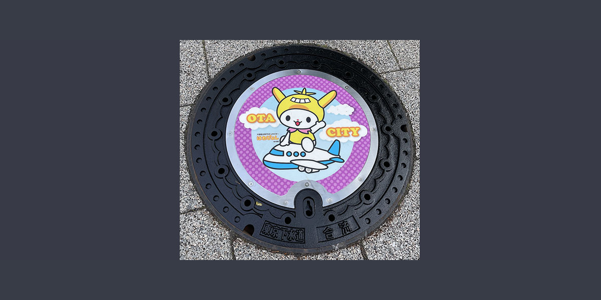 Custom-designed manhole covers featuring Ota Ward's official mascot character "Hanepyon" and local specialties are located in Kamata, Rokugo, and Omori in Ota Ward. The cover in Kamata features "Hanepyon and an airplane," the cover in Rokugo "Hanepyon and a black-kite-shaped kite," and the cover in Omori "Hanepyon, dried seaweed and Omori Furusato no Hamabe Park." The ward hopes the manhole covers help promote its residents' love for their hometown and local tourism.