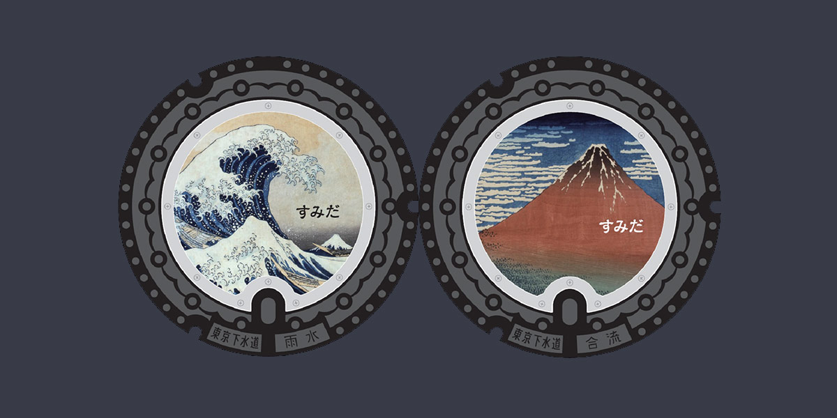 Near Ryogoku Station in Sumida Ward, you will find custom-designed manhole covers featuring "Thirty-six Views of Mt. Fuji" by world-renowned Ukiyo-e artist Katsushika Hokusai. Hokusai was born in Sumida. Although he moved 93 times in the approximately 90 years of his life, he lived mainly in Sumida and left many masterpieces behind him. One of the manhole covers features "The Great Wave off Kanagawa," and the other "Fine Wind, Clear Morning (Red Fuji)."