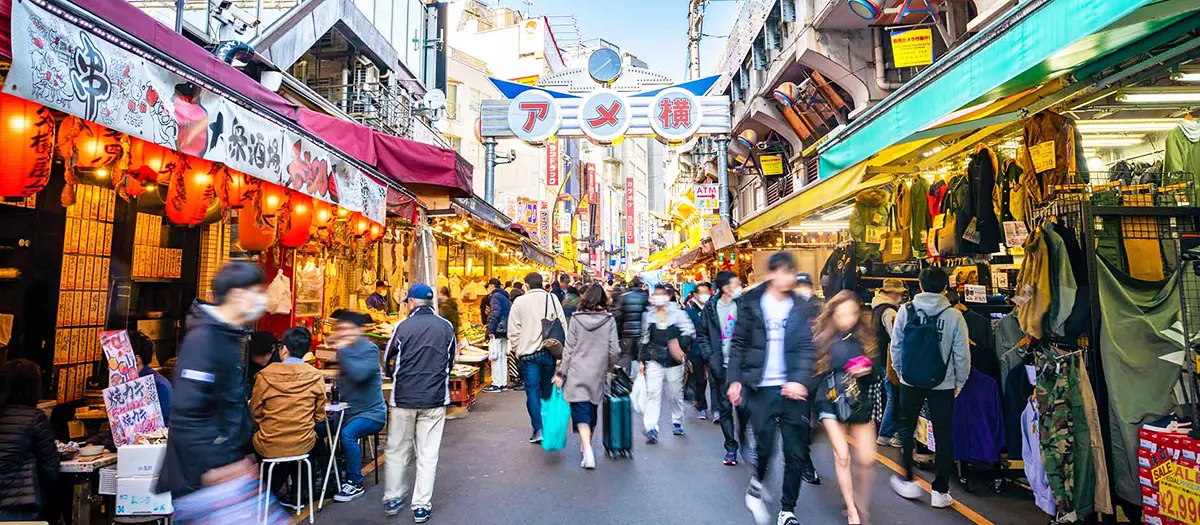 Take a short walk from the bustling transport hub of Ueno Station and find yourself in a cultural and recreational haven. Expansive Ueno Park that sits next to the station houses many museums, a large boating pond, a shrine with a pagoda, and Japan's oldest zoo. The park is the focus of attention in April as the many cherry trees burst into bloom. Follow the train tracks of the Yamanote Line towards neighboring Okachimachi Station to experience Ameyoko—the bustling shopping street where the distinctive calls of market sellers can be heard selling everything and anything from clothes, spices, cosmetics and fresh fish.