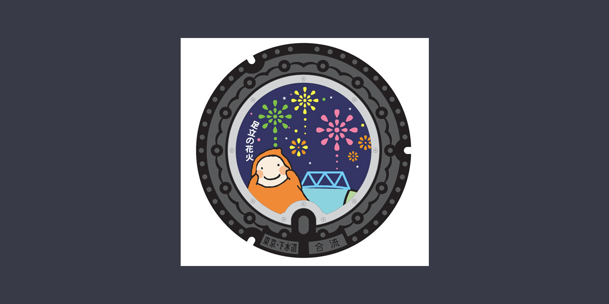 Adachi City’s annual summer fireworks show and the character Byubo from the Beautiful Windows Movement decorate this custom-designed manhole cover. In addition to fireworks, other manholes throughout Adachi City feature Sekiya Village, Adachi Market, Tokyo Budo-kan, Shobunuma Park, Gotanno Pedestrian Mall, and Nishiarai Daishi temple.