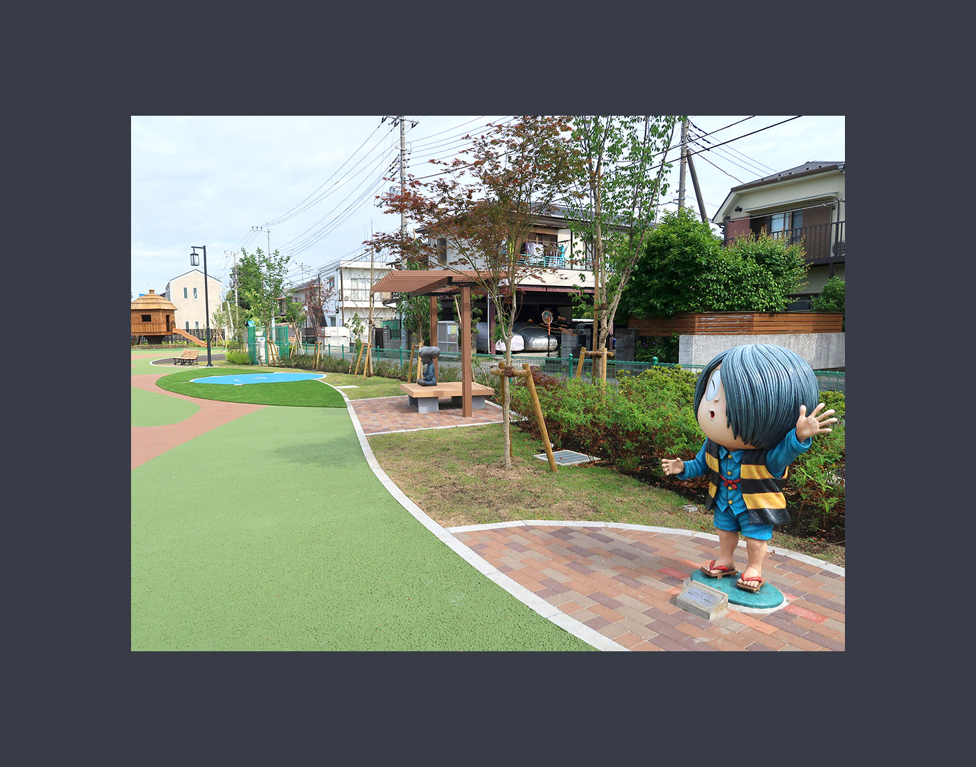 The park has objects and playthings featuring Yokai (spirit-monster) and other characters, including "GeGeGe no Kitaro," from manga artist Shigeru Mizuki.