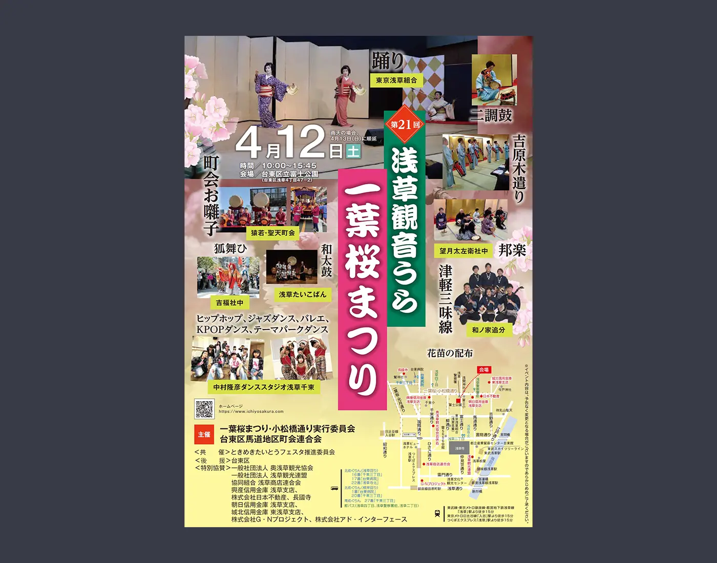 In 2002, 131 ichiyo sakura trees were planted along Ichiyo Sakura Komatsubashi-dori Street, which runs east to west about 500 m north of Sensoji Temple. This festival began along the same street in 2003, the 400th anniversary of the beginning of the Edo period (1603-1867). It features traditional musical performances, work chants, shamisen, and hand-held drums. Local children perform songs, dances, and kabuki shows. There will also be booths and a flea market.