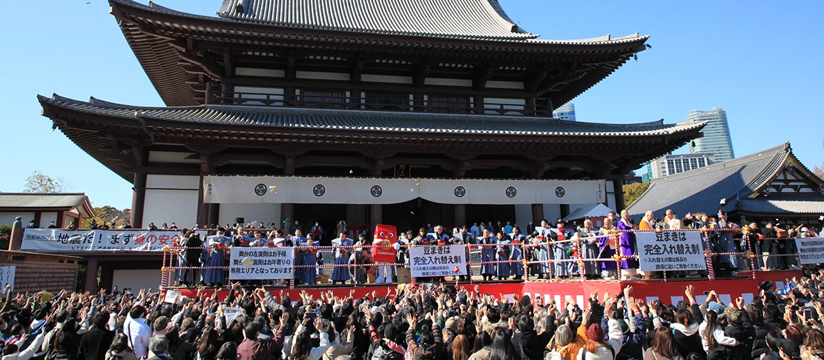 The Setsubun Tsuina Ceremony is a traditional event to drive away misfortune and disaster. At Zojoji Temple it begins with a procession in the temple grounds in front of the Sangedatsumon Gate, an Important Cultural Property of Japan. Men and women born in the current year of the eastern zodiac wear traditional Japanese kamishimo kimono and lead the procession. They are followed by preschool children wearing colorful handmade kamishimo, brightening the temple precincts. Mochi rice cakes are pounded on a specially erected stage, and preschool children perform the Oni-Mondo ceremony, throwing out beans to drive away demons. The main bean-tossing ceremony is performed by celebrities, including sumo wrestlers, sumo stable masters, athletes, and entertainers.