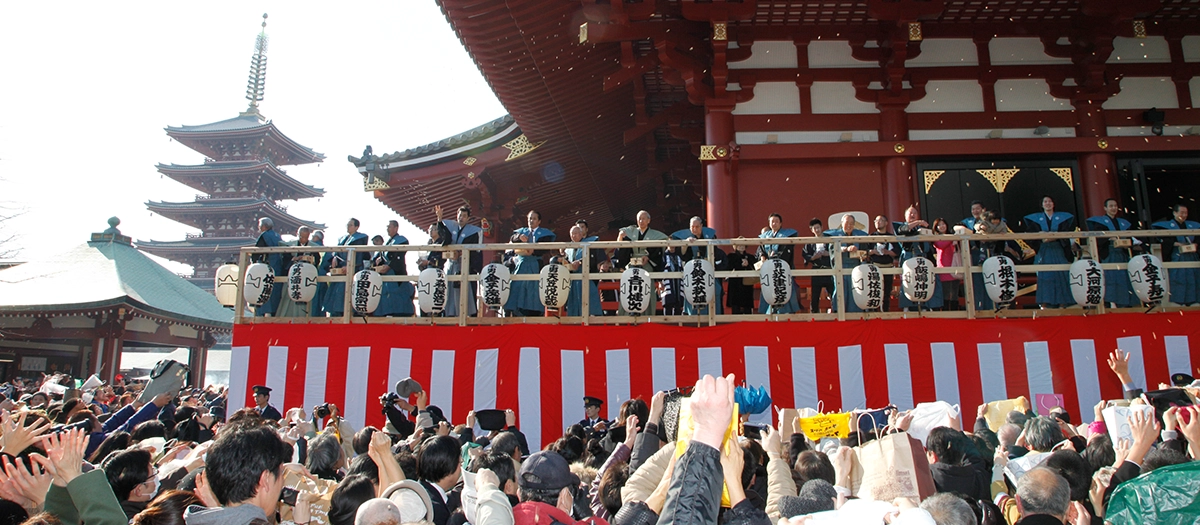 Setsubun is a traditional bean-throwing event held at shrines and temples across Japan. It marks the end of winter. First held for the common people at Sensoji Temple, this large event was memorialized in a legendary old guide to the famous places in Edo (Tokyo's historic name).