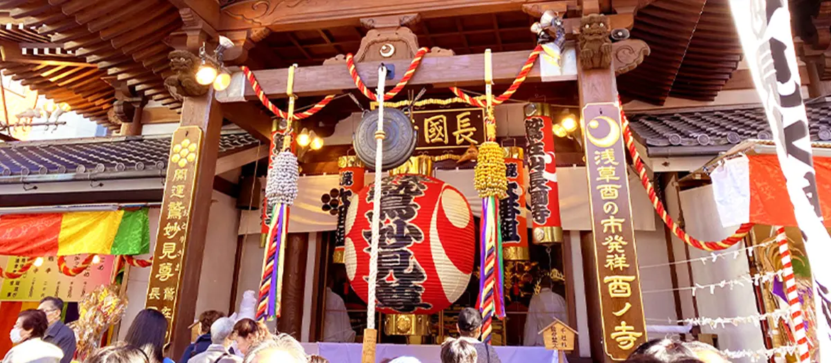 Visit Chokoku-ji Temple for its famous open-air market Asakusa Tori-no-Ichi held every November. This festival has been held for about 250 years and attracts many people who come to pray for good luck and prosperity in business. At the temple, enjoy the bustling atmosphere as people buy up kumade rakes, an item said to bring good luck.