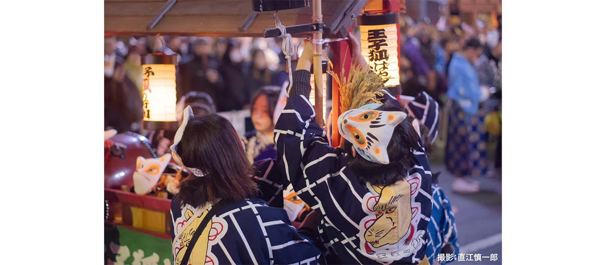 At night on New Year's Eve, roughly 300 participants wearing traditional Japanese clothing and fox masks walk from Shozoku Inari Shrine to Oji Inari Shrine, carrying yellow paper lanterns that represent the “foxfire.”