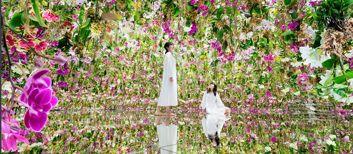 The artworks are large-scale fusions of color and light that change as you walk in and around them. As you arrive at the gallery, you first take your shoes off in the Water. You explore the space barefoot, at times wading knee-deep in water. The Garden has you walking among a garden of over 13,000 real flowers—blending nature with technology. You can get lost in the same way you might get lost in a forest. It's a multisensory experience.