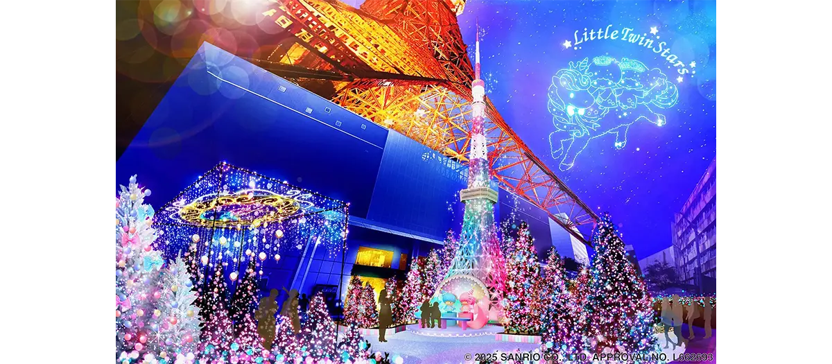 "Tokyo Tower Winter Fantasy 2025 Little Twin Stars Xmas Illumination" begins November 17 (Monday), 2025 and celebrates the 50th anniversary of the popular characters, Little Twin Stars. 43,000 LEDs bring vivid color to the Christmas season. The magical, 10-meter "LITTLE TOKYO TOWER" in the Tower Garden is lit up in pink and blue—the colors of Kiki and Lala. From 16:00, there's a light show set to their song, "Twinkle My Dear." There are more pink and blue lights in the Twinkle GARDEN, plus ribbon ornaments decorating cute white trees, creating a photogenic space where you can immerse yourself in Kiki and Lala's colorful, starry world.