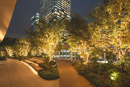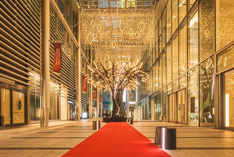 In the first floor Galleria, Tokyo Midtown Yaesu has erected a five-meter tall Christmas tree inspired by kintsugi. The tree’s branches are crafted from wood from Noto Peninsula and Tokyo and emblazoned with golden light. The first-floor atrium is also home to a kintsugi exhibition and kintsugi workshops. A portion of the workshops’ proceeds will be donated to Ishikawa’s reconstruction efforts. Additional illuminations include diamond-shaped lights dangling from Galleria’s ceiling and warmly lit trees on the fifth-floor terrace.