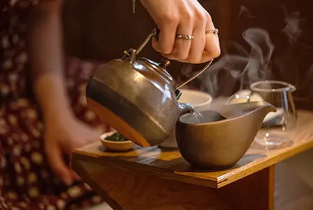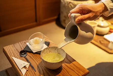Close your eyes and let the cleansing fragrance of incense and melody of running water guide you through the noren—Japanese entrance curtain. Welcome to Takizme, a tea house in a quiet residential area of Tokyo where you can embrace the present and enjoy Japanese tea culture in a casual manner. The most popular course “Welcoming Tea” starts with a reset of the senses—using incense for smell, boiled water for the palate, and mindful meditation for the brain. Afterwards, the host prepares four pairings of personally-crafted seasonal sweets and high quality Japanese teas. Throughout the experience, he encourages you to use all your senses and welcomes conversation, aiming to create a joyful tea experience free from rules. At the end, as your mind and body are fully immersed in the present, your heart will beat in rhythm with every drop of tea.